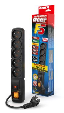 acar F5 to najpopularniejsze urządzenie zabezpieczające z rodziny acar-AXON. Przy długości niespełna 33cm daje do dyspozycji pięć gniazd sieciowych z uziemieniem. Ilość ta, w większości zastosowań jest wystarczająca, a stosunkowo niewielkie rozmiary pozwalają na swobodne umieszczenie go nawet na biurku. Zastosowany bezpiecznik automatyczny pozwala nazwać go praktycznie bezobsługowym. Duża skuteczność działania predysponuje go do miana zabezpieczenia podstawowego, niezbędnego w każdym miejscu. Uchwyty do mocowania są opcjonalnie dostępne u dystrybutora.