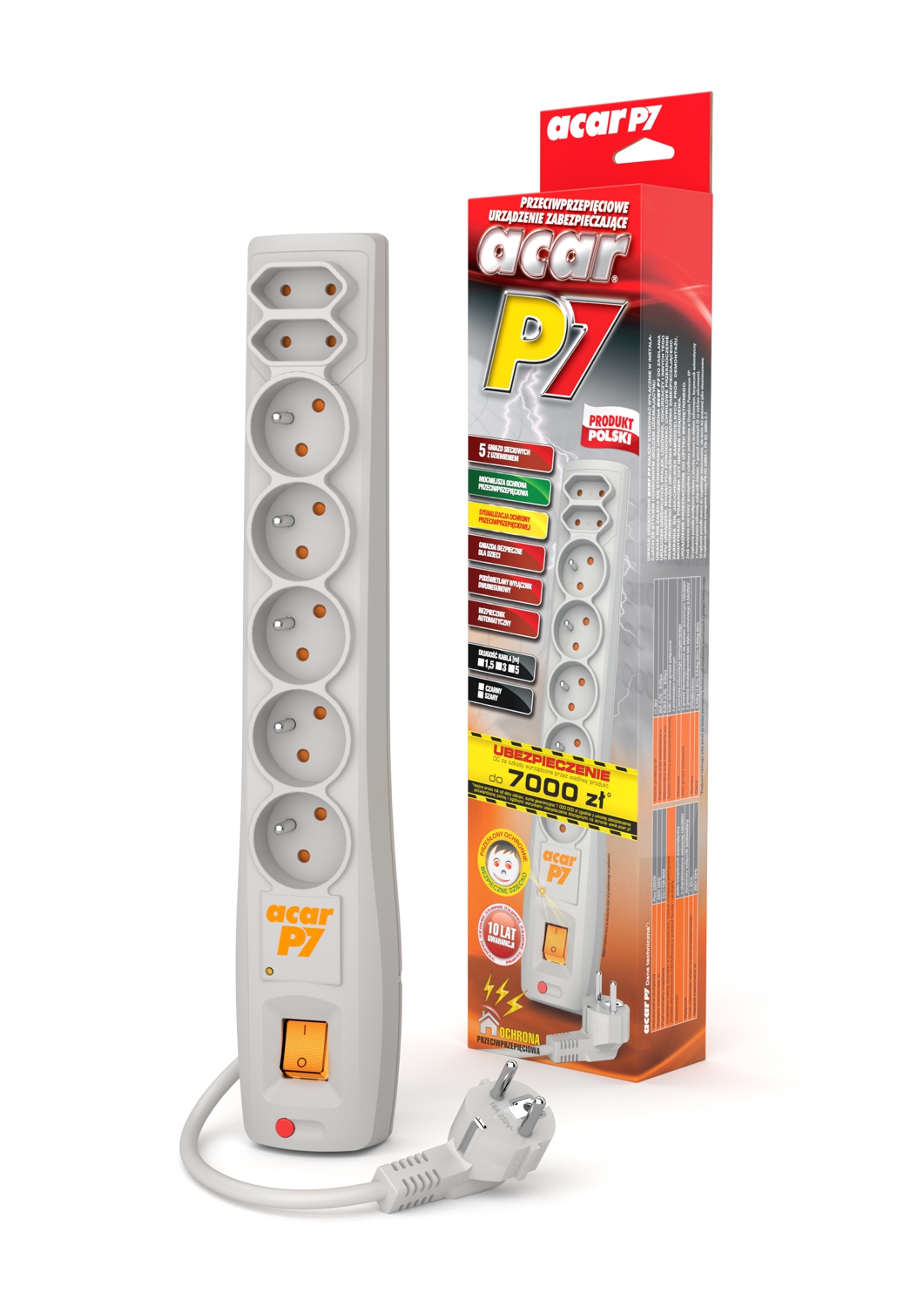 acar P7 to model z siedmioma zabezpieczonymi gniazdami sieciowymi 230V, w tym 5 z uziemieniem i 2 płaskimi bez uziemienia. acar P7 jest wyposażony w automatyczny bezpiecznik, gwarantujący prostotę i skuteczność działania.