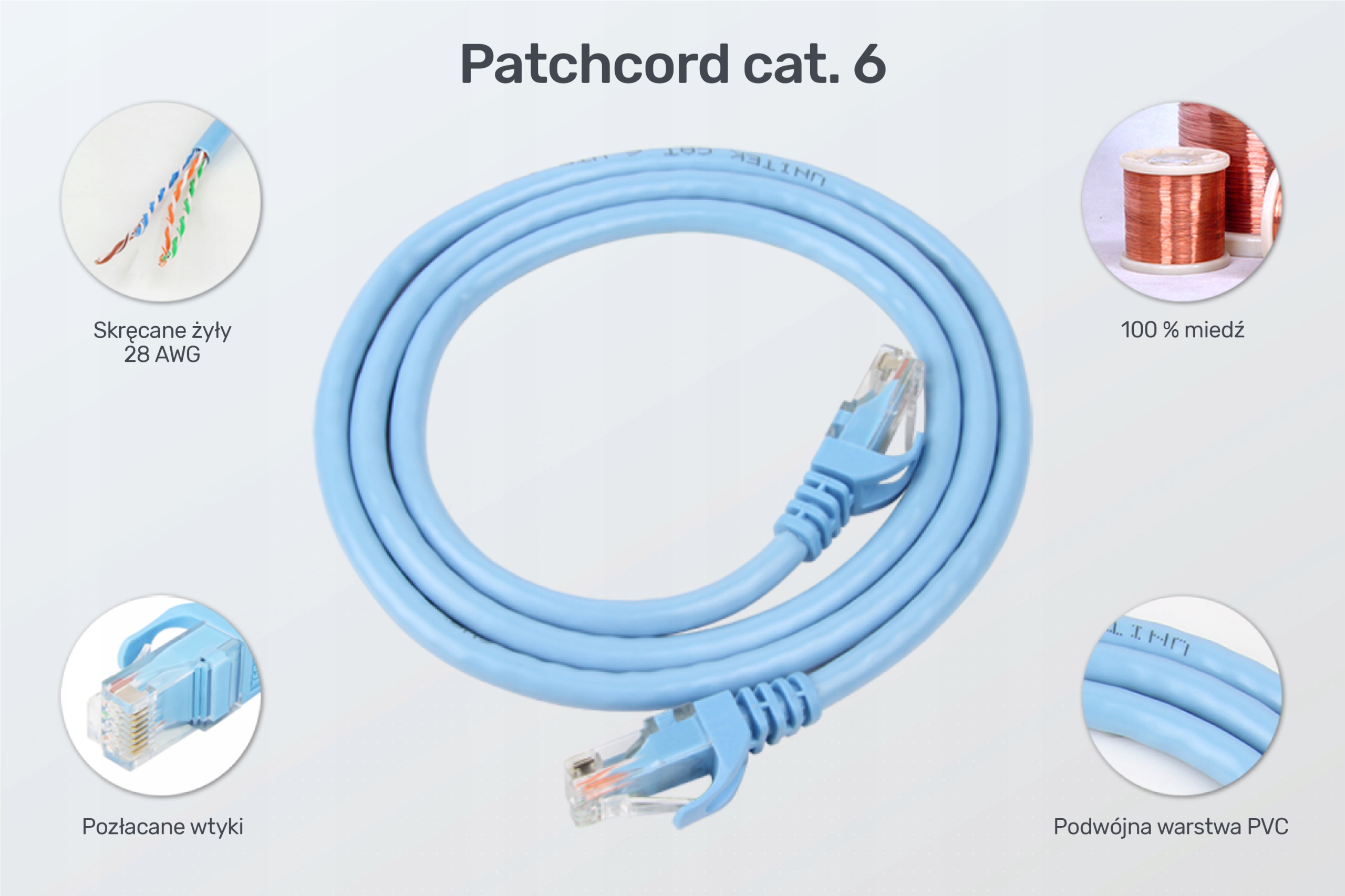 Maksymalna przepustowość przewodu to 1 Gbps przy częstotliwości 500 MHz, co zapewnia Ci płynne korzystanie z Internetu bez żadnych opóźnień. W ofercie Unitek są patchcordy 6. kategorii długości 1, 2, 3, 5, 10 i 15 m.